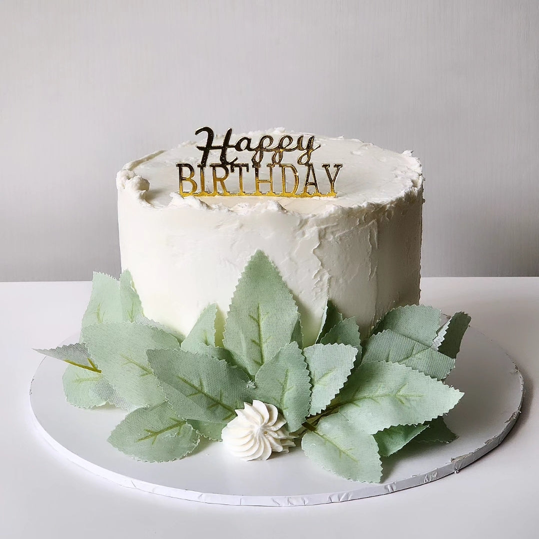 This cake is made with a moist and fluffy vanilla or chocolate sponge, and it's layered with a creamy vanilla buttercream frosting, and artificial leaves to finish it off.