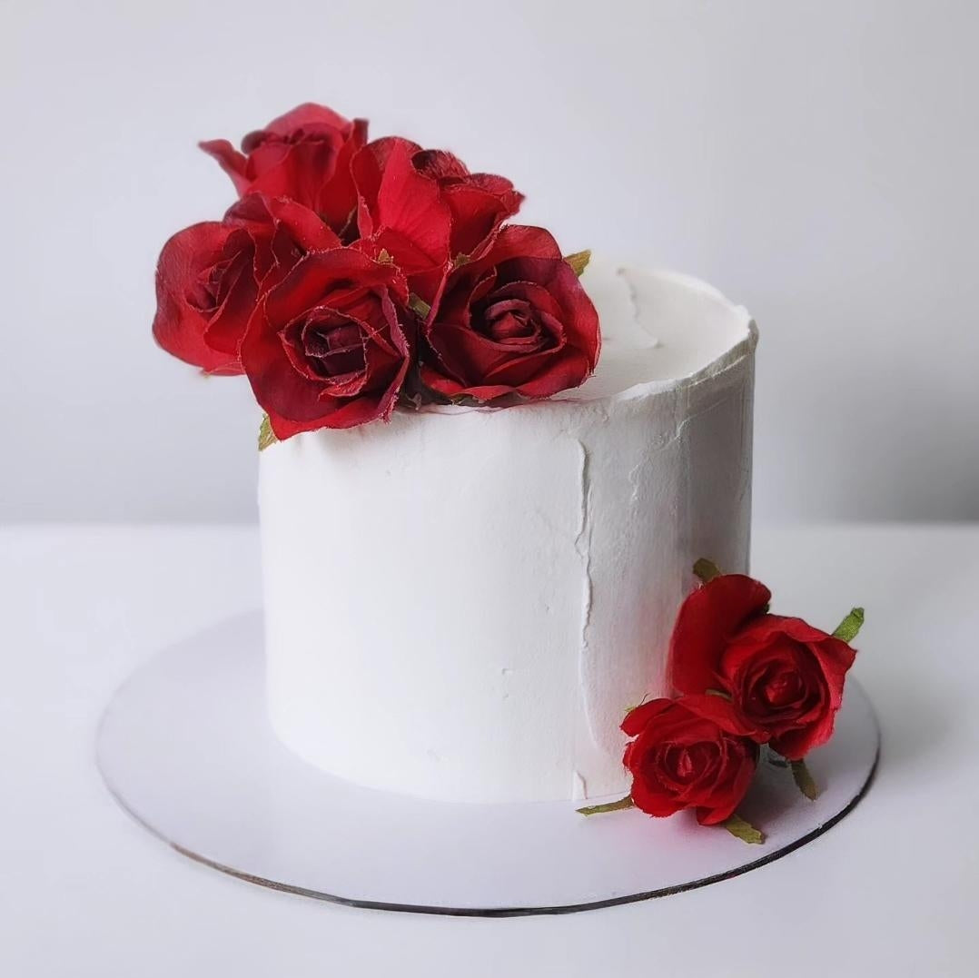 Unit price perIndulge in the elegant Empress Cake. This cake is made with a moist and fluffy chocolate or vanilla sponge, and it's layered with a creamy vanilla buttercream frosting and finished of with red roses.