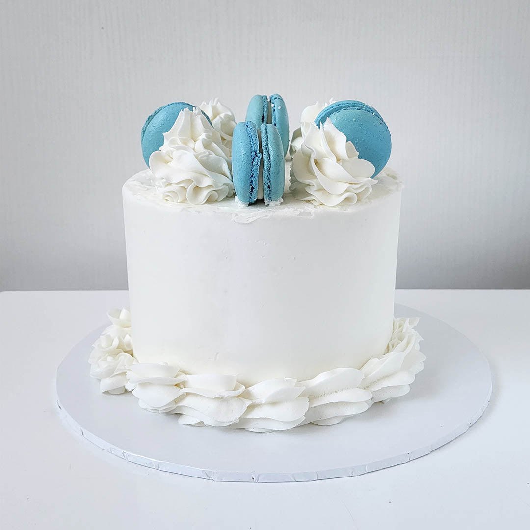 Indulge in a sophisticated and delicious dessert with this White Marvelous Cake with 4 Blue Macarons. This cake is made with a moist and fluffy vanilla or chocolate sponge, and it's frosted with creamy white frosting. The frosting is made with confectioners' sugar, and it's flavored with a hint of vanilla extract for added depth. This elegant cake is then finished with 4 delicate blue macarons, adding a pop of color and a touch of French flair. Whether you're hosting a bridal shower or just want to treat yourself, this White Marvelous Cake with 4 Blue Macarons is sure to impress. It's the perfect combination of classic vanilla flavor and indulgent sweetness.