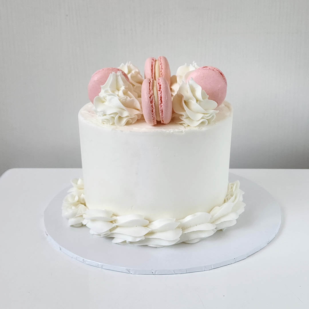 Unit price perIndulge in a sophisticated and delicious dessert with this Marvellous Pink Cake with 4 pink Macarons. This cake is made with a moist and fluffy vanilla or chocolate sponge, and it's frosted with white frosting. The frosting is made with confectioners' sugar, and it's flavored with a hint of vanilla extract for added depth. This elegant cake is then finished with 4 delicate macarons, adding a pop of color with a twist. Whether you're hosting a baby shower or just want to treat yourself, this Marvellous Pink Cake with 4 Macarons is sure to impress. It's the perfect combination of classic vanilla or chocolate flavor and indulgent sweetness.