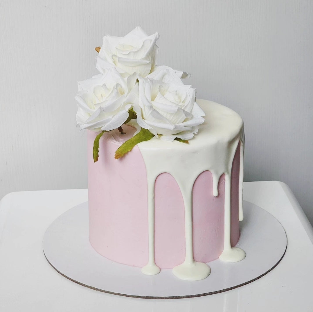 Unit price perIndulge in a sophisticated and delicious dessert with this Pink Beauty Cake. This cake is made with a moist and fluffy vanilla or chocolate sponge, and it's frosted with creamy pink frosting. The frosting is made with confectioners' sugar, and it's flavored with a hint of vanilla extract for added depth. This Pink Beauty Cake is then finished with a few white silk roses and a drizzle of creamy white chocolate ganache, adding a touch of romance and indulgence to every bite. Whether you're hosting a bridal shower or just want to treat yourself, this Pink Beauty Cake is sure to impress. It's the perfect combination of classic vanilla or chocolate flavor and indulgent sweetness.