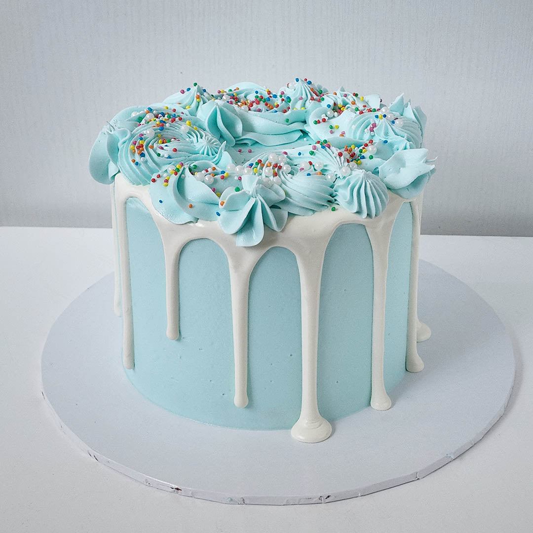 Unit price perIndulge in a playful and delicious dessert with this Sprinkle Dream Cake. This pastel blue cake is made with a moist and fluffy vanilla or chocolate sponge, and it's frosted with a swirl of creamy blue frosting. The frosting is made with confectioners' sugar, and it's flavored with a hint of vanilla extract for added depth. This Sprinkle Dream Cake is then finished with a white chocolate drip, and a generous sprinkle of colorful sprinkles, adding a pop of color and a touch of whimsy to every bite. Whether you're hosting a birthday party or just want to treat yourself, this Sprinkle Dream Cake is sure to delight. It's the perfect combination of classic vanilla or chocolate flavor and indulgent sweetness.