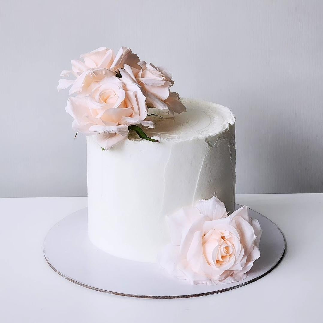 Indulge in this elegant Blushing Blooms Cake. This cake is made with a moist and fluffy chocolate or vanilla sponge, and it's layered with a creamy vanilla buttercream frosting.